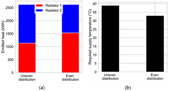 Impact of applied uniform heat loads: (a) Heat distribution; (b) Potential to reduce the supply temperature for both radiators.