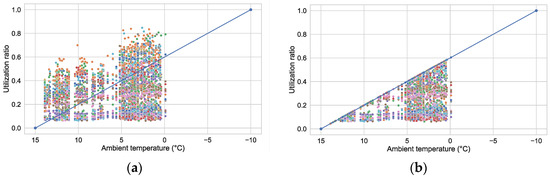 Figure 14a presents a scatterplot of all operational states relative to the ambient temperature from 1 January 2021 to 10 January 2021, which ranged from approximately 0 °C to 14 °C. The blue line signifies the estimated heat requirement, according to Section 2.2.4. Numerous data points are positioned above the indicated heat requirement, signaling an oversupply of heat. Each color within the plot corresponds to a specific radiator, enabling a detailed examination of individual heating behavior.