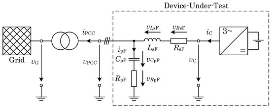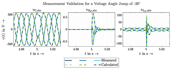 In order to obtain the measured variables at the converter, back calculations must be performed with knowledge of the filter variables. In principle, it would be possible to carry out these calculations with complex numbers. In this case, this is not possible because a dynamic and exact measurement of the grid frequency is required. In order to be able to represent the transient processes exactly, a rough estimate of the frequency is not sufficient. The challenges of such a frequency measurement are described in Section 2.4. In summary, the complex calculation is not recommended here and the differential equations must be set up. The voltages in Figure 1 can be expressed as: