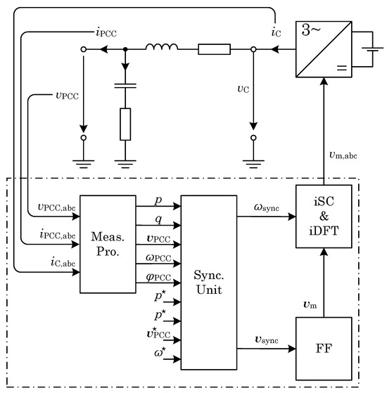 Furthermore, no current controllers are implemented. The synchronisation voltage is only passed through a complex feedforward before the inverse SC and the inverse DFT. The control scheme is shown in Figure 6.