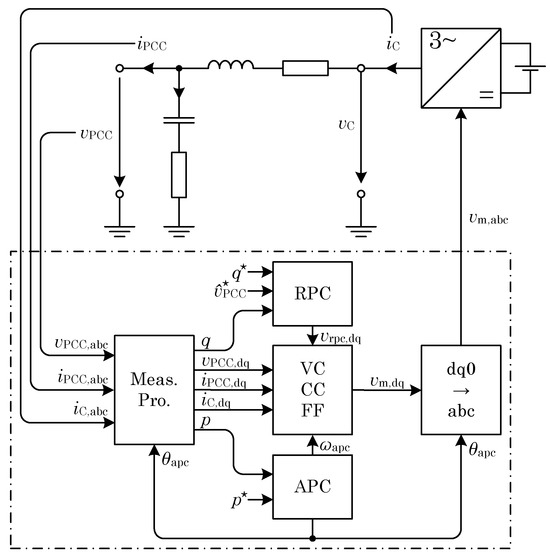 The main task of the current control is to realise the higher-level power specifications as dynamically as possible. For this purpose, the control runs in a rotating coordinate system that rotates with the identified phase angle . This makes it easy to compare the reference current with the measured current and control it with a PI controller. The voltage difference calculated by the PI controller is added to the grid voltage and the filter voltages in the feedforward (FF) control as Equation (5) shows.