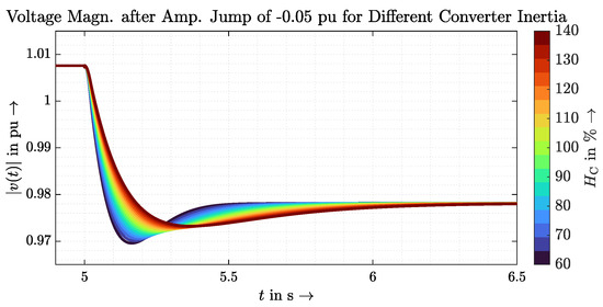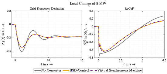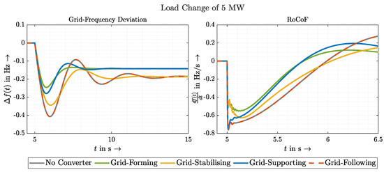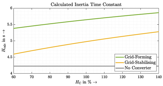 Without discussing the exact values, it is clearly visible that a GVFM control increases the value of the measured inertia. This also coincides with the results from Section 3.2 concerning the RoCoF. The GVFL control, on the other hand, is not able to improve the value; in this investigation, it even worsens it. Taking into account the mentioned inaccuracy, it can at least be stated that a GVFL control, in contrast to the GVFM control, does not improve the inertia of the system.