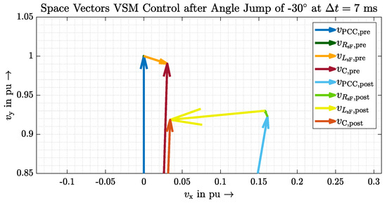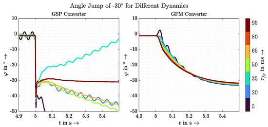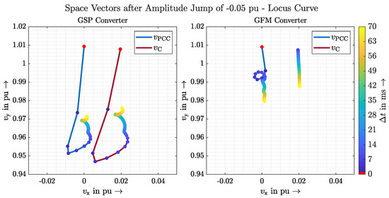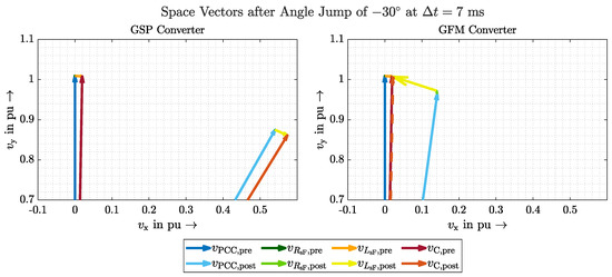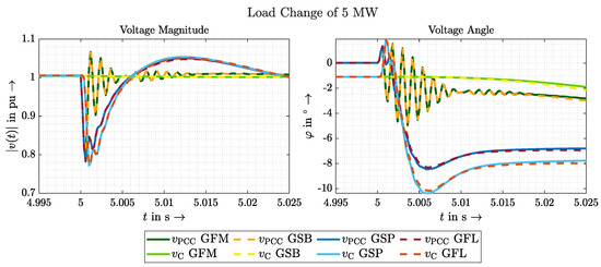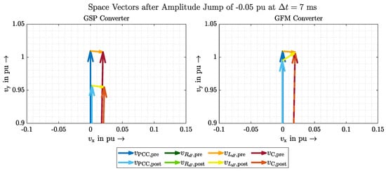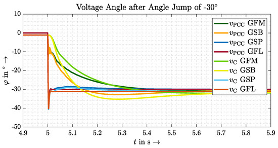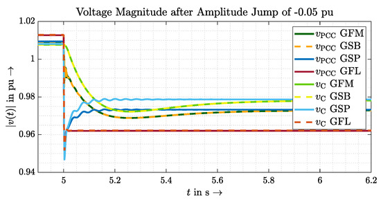 In general, all scenarios are suitable in this work to determine clear differences between GVFM and GVFL and thus to prove GVFM’s behaviour. A requirement for the amplitude jump, however, is a delayed control of the voltage amplitude, which is not given in the VSM model discussed, for example. The angle jump, on the other hand, must be designed in such a way that the available energy reserves are taken into account and that the current limits are not exceeded. This would force the converter to limit the current and perhaps give up stabilising the grid through inertia. How exactly to define the desired behaviour and prioritisation of a GVFM control in such a case should be the subject of further research.