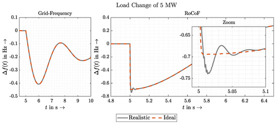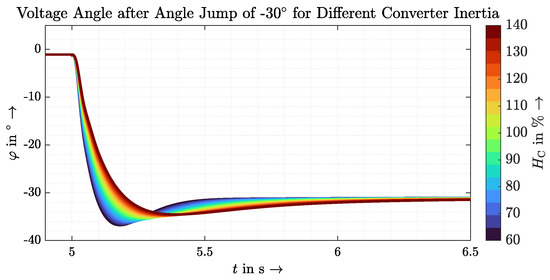 Due to the similar approach, the similarity with the grid model used in Figure 3 can be seen. In this implementation, an additional primary control was deliberately avoided to make it more comparable. The inertia can be adjusted via H. This inertia affects both changes in the grid measured by p as well as changes in the reference power . While the former is desirable, the latter is not necessarily wanted.