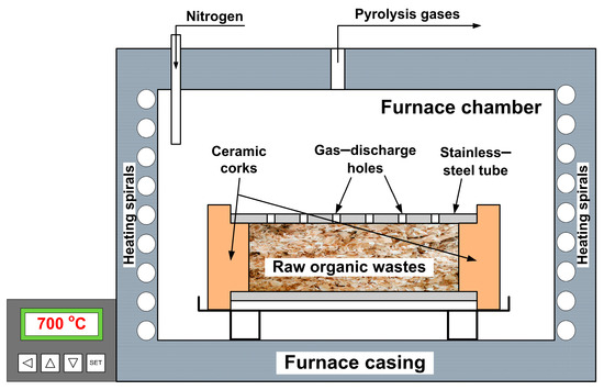 The utilization of untreated raw organic waste in an MH-DCFC poses challenges due to the significant amount of volatile matter (VM) within the structure of organic material. Those VM can potentially disrupt the electrochemical reactions in the anode compartment and result in performance degradation. Therefore, a thermal pretreatment was employed on all waste materials to produce biochar, enhancing their suitability for use in the fuel cell. The biochar was prepared using a raw organic waste carbonization process, by heating the samples from 300 to 973 K at a rate of 10 K min−1 under N2 atmosphere. Selected waste were placed in a stainless-steel tube reactor (see Figure 3) with an internal diameter of 30 mm and length of 120 mm. Both ends of tube were then closed by ceramic corks and the reactor assembly was placed in a muffle chamber of an electric heating laboratory furnace. Figure 4 shows the heating profile (temperature–time profile) of the pyrolysis (carbonization) of individual samples, which allowed the sample to be heated in a controlled and reproducible manner. After the desired heating time, the reactor was withdrawn from the furnace and cooled down to ambient temperature still under N2 atmosphere, therefore the obtained biochar samples did not contain moisture that could be absorbed by samples from the air during the cooling process. The resulting biochar was then sieved to a size range of 180–250 µm (in order to compare of the obtained results with research results from other works that have been conducted by authors [17,31,32,33]) and then stored in a glass desiccator.