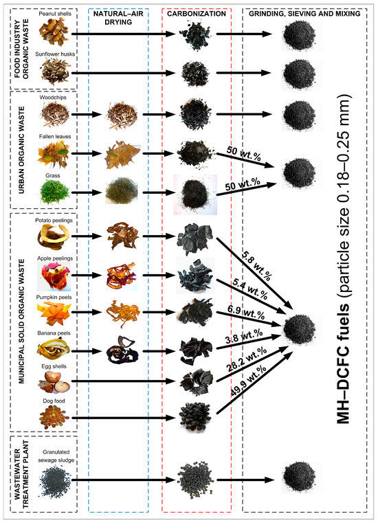 A sample preparation flowchart is shown in Figure 5. It is a flow chart showing the sequence of organic waste treatment to obtain biochar—suitable fuel for the MH-DCFC supplying.