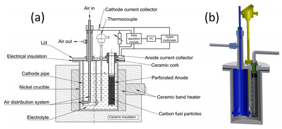 A schematic diagram of the MH-DCFC experimental apparatus: (a) design, (b) 3D visualization.