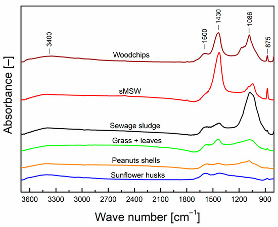 The FTIR spectra of all examined biochar are shown in Figure 7 and the FTIR wave number identification was summarized in Table 3. In all tested samples, a wide band in the range 2800–3600 cm−1 (peak centre located at 3400 cm−1), attributed to –OH stretching vibration groups in alcohols, phenols and carboxylic acids (or may be attributed to vibration in hydroxyl group derived from the water molecules absorbed by carbon material during the grinding of KBr and preparation of the pellets), was observed. Moreover, a band number between 1550 and 1680 cm−1 (peak centre located at 1600 cm−1) and 1350–1460 cm−1 (peak centre located at 1430 cm−1), which were assigned to C=C and C-H stretchings, respectively, were also present in the spectra of all biochar. The wide peak located at wave number 1430 cm−1 can be also attributed to C–O–H bending vibrations of carboxyl group. A band at 1086 cm−1 may be assigned to C–O–C stretching vibration of cyclic ethers and the stretching vibration of C–O groups in alcohols, phenols, esters and carboxylates. On the other hand, Si–O–Si stretch has a strong, broad IR band in the 1000–1100 cm−1 region with peak centre around 1080 cm−1. Taking into account the results of ash and oxygen content in the tested biochar (Table 2) and recorded FTIR spectra (Figure 7), the peak located at 1086 cm−1 should be assigned to the Si–O–Si stretch band. The band at 875 cm−1 clearly observed in the woodchips and sewage sludge FTIR spectrum was assigned to calcite. Generally, the more ash in the sample, the more the pronounced peak located at the wave number 1086 cm−1, while the more oxygen contained in the biochar, the more the pronounced peak at 1430 cm−1.