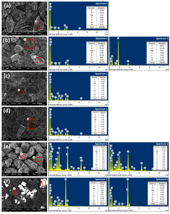 Scanning electron micrographs (SEM) and EDX spectrograms of different biochar samples: (a) sunflower husks, (b) woodchips, (c) grass+ leaves, (d) peanuts shells, (e) sewage sludge, (f) sMSW.