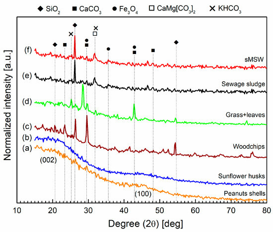 Figure 9 presents the XRD patterns of the carbonized waste samples. XRD patterns have been extensively used to determine the level of carbonization (pyrolysis) and to characterize the inorganic compounds present in the biochar structure. The broad hump in the region 15°–30° indexed as (002) in the biochar samples obtained from grass+ leaves, woodchips, sunflower husks and peanuts shells (Figure 9a–d) could be assigned the stacking structure of aromatic layers, and the broadening has originated from the small dimensions of crystallites perpendicular to aromatic layers. Similarly, another broad hump in the region 40°–50° visible in biochar from woodchips, sunflower husks and peanuts shells (Figure 9a–c) is due to crystal plane index of (100). This (100) peak is due to condensed aromatic carbonized planes. Thus, peaks depict the appearance of a degree of crystalline orientation of C in biochar samples. As expected, sharp and intense signals attributed to minerals were observed in several biochar samples that also contained higher inorganic content. Quartz (SiO2), calcite (CaCO3), magnetic iron oxide (e.g., magnetite; Fe3O4) and dolomite (CaMg[CO3]2) were common features in the analysed samples (Figure 9c–f). The presence of kalicinite (KHCO3) was also observed for three biochar samples (Figure 9d–f). Fuels with the lowest ash content (sunflower hulls and peanut shells; see Table 2) did not show peaks corresponding to, e.g., SiO2, CaCO3 or Fe3O4, which were visible in the case of other high ash content carbonized organic waste.