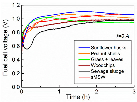 In all cases, the cell voltage exhibited a gradual increase until it reached a stable plateau after approximately 2 h, remaining relatively constant thereafter. Differences in the OCV values, particularly during the initial period of around 0.5 h, were likely a result of the progressive wetting of the inner surface of the biochar particles by the liquid molten electrolyte [17].
