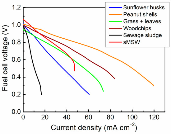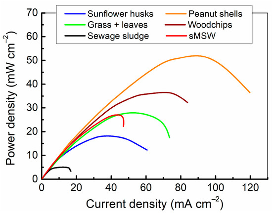 The maximum power density made up 53.1 mW cm−2. The lowest value was determined for sewage sludge (5.1 mW cm−2), while the best results were obtained for peanuts shells. Similar values were obtained for Grass + leaves and sMSW, 27.97 and 27.25 mW cm−2, respectively.