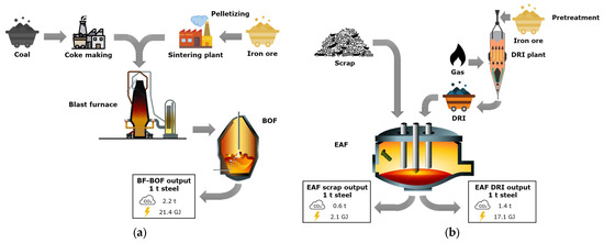 Energy consumption and CO2 emissions in the steelmaking process: (a) BF-BOF route; (b) EAF route [2,21,22].