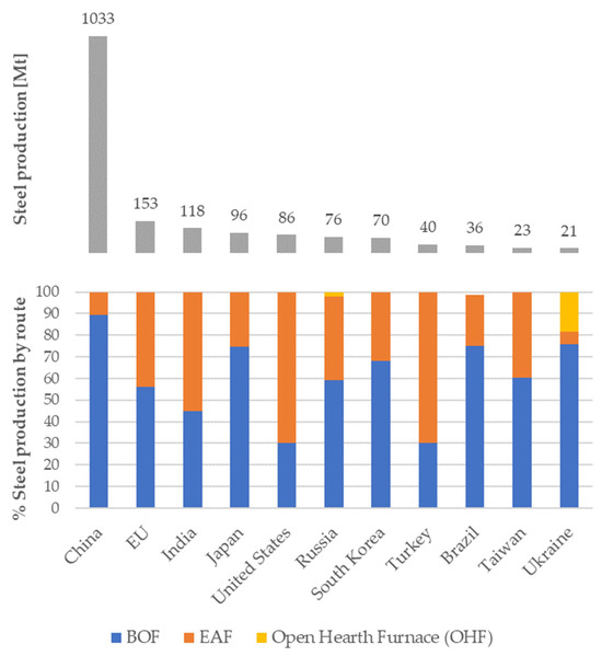 Crude steel production by production route for the year 2021 [6].