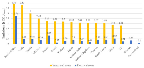 Steel can be produced through different routes: the primary or integrated route and the secondary or electric route. In the primary route, steel is produced from iron ore and coal or coke in a blast furnace (BF) and a basic oxygen furnace (BOF), and it has high CO2 emissions despite being very efficient when it comes to energy consumption [2,4,20]. As can be seen in Figure 1a, the CO2 emissions are around 2.2 tons of CO2 per ton of produced crude steel [2,4,5,16,20]. It should be noted that these emissions vary from country to country and that the CO2 emissions are between 1.8 and 4.0 tons of CO2 per ton of crude steel for most of the countries, with China and the EU reporting lower CO2 emissions (1.84 tons of CO2 and 1.81 tons of CO2, respectively) and South Africa and India generating more than 3.8 tons of CO2 per ton of steel [5,20]. The integrated route is predominant in worldwide crude production, accounting for almost 71% of crude steel production. The BF-BOF route for European steel production accounts for around 56% of the total steel production, whereas in the USA, only 31% of the steel is produced through the primary route [6].