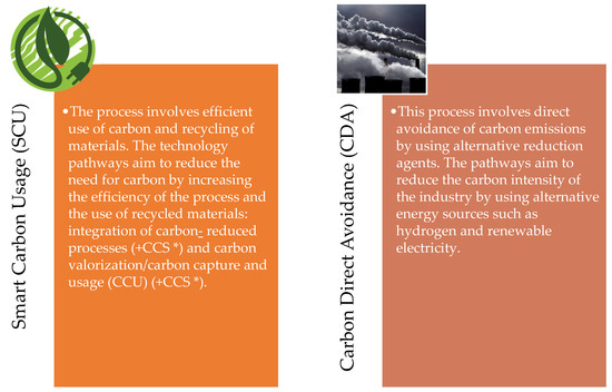 Decarbonization in the steel industry requires substantial changes in the supply and production chains. Consequently, the challenge could be likened to a new industrial revolution, both in terms of complexity and duration. The current scenario presents a situation where the global transformation would be possible thanks to a hydrogen-based steel industry, as well as the adaptation of fossil-fuel-based steel processes for residual carbon capture and utilization technologies and, finally, an increase in the consumption of scrap as a raw material and the recycling of steel byproducts. To this end, as illustrated in Figure 4, there are two technological pathways for CO2 reduction in the sector: smart carbon utilization (SCU) and carbon direct avoidance (CDA) [16]. Some proposed and ongoing projects of the EU steel industry have been identified for this purpose [16,52]. Energy, feedstock, and carbon storage are therefore the most important elements in this major challenge.