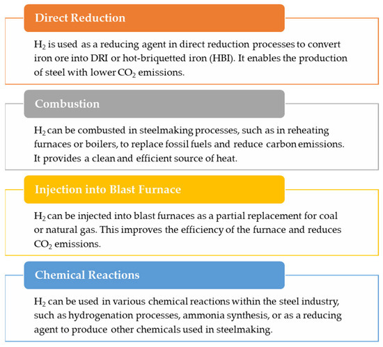 Hydrogen’s potential future applications in the steel sector [79,84].