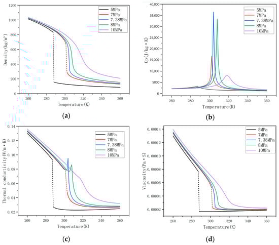 Variation in the thermal properties of CO2 with temperature at different pressures: (a) constant-pressure specific heat capacity, (b) densities, (c) thermal conductivity, and (d) kinematic viscosity. (The critical pressure of CO2 is 7.38 MPa. When the pressure of CO2 is below its critical pressure, it undergoes phase changes with increasing temperature, which is represented by dashed lines for subcritical CO2 phase changes in Figure 2).