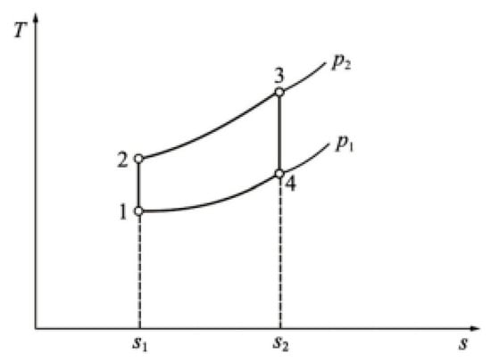 The fundamental Brayton cycle comprises four stages: isentropic compression (1→2, compressor), isobaric heating (2→3, recuperator), isentropic expansion (3→4, turbine), and isobaric cooling (4→1, precooler), as shown in Figure 3. The Brayton cycle system primarily incorporates five components: a heat source, turbine, recuperators, precooler, and compressor. The cycle occurs as follows: (1) The compressor compresses SCO2, which is subsequently elevated to higher temperatures by the heat source. (2) The heated and pressurised SCO2, which has high-temperature and high-pressure characteristics, is directed into the turbine machinery. It propels the turbine and drives it to perform mechanical work that powers the generator to produce electricity. (3) After this phase, SCO2 is channelled into the precooler, which is cooled to its initial temperature and primed for the subsequent cycle.