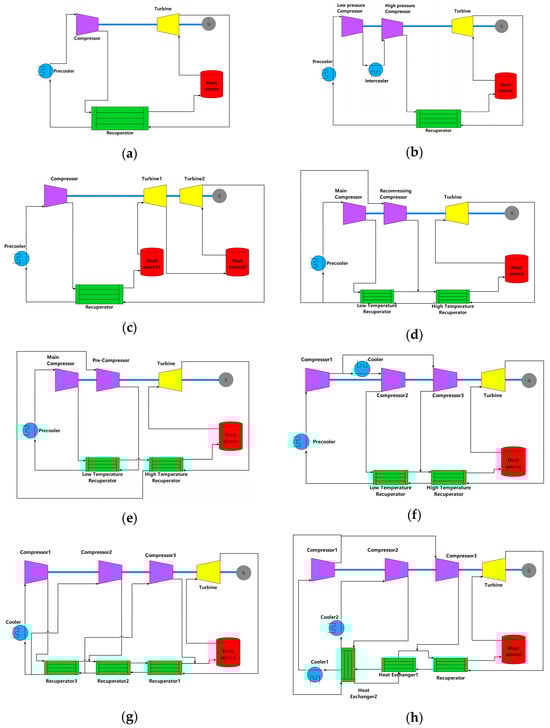 Owing to the significant potential of the SCO2 Brayton cycle, researchers have conducted in-depth studies on its diverse configurations. Figure 5 shows the archetypal design of a conventional SCO2 Brayton cycle. This design encompasses various iterations, including a simple reheat cycle, recompression cycle, reheating cycle, intermediate cooling cycle, precompression cycle, two iterations of the partial cooling cycle, a dual compression cycle, and an advanced reheat cycle. The detailed cycle parameters for each configuration, complemented by their respective merits and limitations, are listed in Table 2.