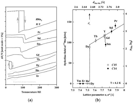 The RMn2 compounds have been widely studied because of their very interesting structural and magnetic properties. Changes of the unit cells for RMn2 as a function of the temperature are presented in Figure 1a []. For the (Tb, Gd, Sm, Nd, Pr, Y)Mn2 compounds, the first-order phase transition is observed, and temperature dilatometer and X-ray diffraction measurements revealed significant increases in the volume of unit cells of these alloys at temperatures below 105 K. The magnetic ordering was also observed below the temperatures of the structural changes [,,]. The largest, an almost 5% change in volume, was recorded for YMn2. This significant magneto-volume effect is related to the appearance of a well-localized magnetic moment in the Mn sublattice (~2.7μB) below the magnetic ordering temperature []. The (Er, Ho, Dy)Mn2 compounds do not show changes in the volume cell; they undergo a second-order phase transition in the temperature range of 15–35 K [,].