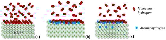 Simplified mechanism of hydrogen absorption in metal. (a) Physical adsorption: hydrogen molecules adhere to the metal surface, forming several layers; (b) Chemical adsorption: dissociated hydrogen molecules of the layer in direct contact with the metal form chemical bonds with it; (c) Absorption: hydrogen atoms diffuse into the parent metal lattice.
