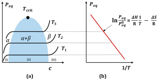 (a) Schematic plot of hydrogen absorption in metal (p-c-T isotherms). Peq—gas pressure, c—hydrogen concentration in the metal; (b) Construction of the Van’t Hoff relation. Based on [,].