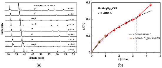HoMn2Hx. (a) The XRD patterns for different x; here, α represents the cubic phase (), and β represents the rhombohedral phase (); (b) Relative change in the unit cell volume as a function of x [].