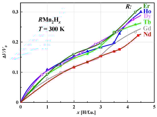 For x < 3.0 H/f.u., the curves, except for those corresponding to (Gd and Nd)Mn2Hx, are almost identical. At values greater than x ≈ 3.0 H/f.u., distinct behavior becomes visible with increasing x, especially for concentrations close to the maximum, where the relative increase in volume increases with the atomic number of the rare earth element.