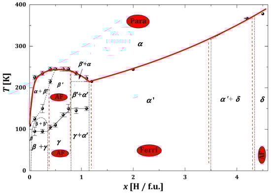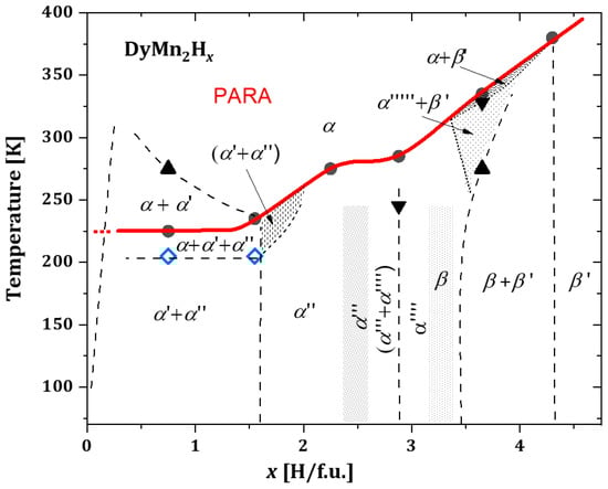 Structural hydride studies have also been carried out for a series of DyMn2Hx hydrides []. Their structural phase diagram is largely similar to the structural phase diagrams of (Gd or Tb)Mn2Hx, which have been reposted above. The phase diagram of the Dy hydrides (Figure 11) has been described using a combination of two phases: the regular (C15 type) phase denoted as α and the rhombohedral () phase denoted as β. The apostrophes (′) next to the phase symbols refer to the different hydrogen concentrations in the phase or indicate the ordered magnetic state of the sample (e.g., α and α″ for x ≈ 2.0 H/f.u.).