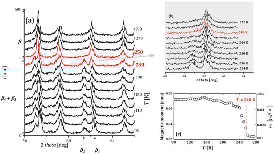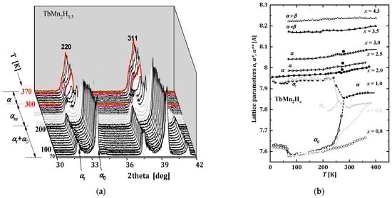 For TbMn2Hx, 1.8 ≲ x ≲ 3.3, hydrides persist one regular phase (α) in the whole temperature range. The increase in parameters for x = 2.0, 2.5, 3.0 is continuous, and weak jumps are observed (marked as black dots) only in the temperature range of 270–280 K (Figure 8b), which corresponds well to magnetic ordering temperature for these hydrides.
