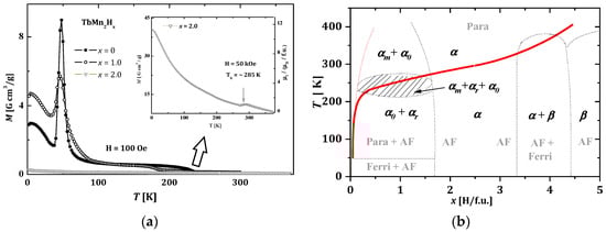 The spinodal decompositions into two phases (αo + αr) were confirmed using magnetic measurements. Figure 9a shows the dependence of magnetization as a function of temperature for TbMn2Hx (x = 0, 1.0 and 2.0 H/f.u.). The characteristic maximum for TbMn2 at ~50 K (compare the parameters that increase in Figure 1a) is also visible in the magnetization of hydride with x = 1.0 what corresponds to α0 phase. Magnetic ordering of the αr phase is estimated at ~240 K. For x = 2.0, hydride magnetization is a flat curve (100 Oe) in the whole range of temperatures with only exceedingly small irregularities at ~280 K that clearly have been expressed/exposed in the external field of 50 kOe (insert in Figure 9a). This maximum indicates antiferromagnetic ordering, as confirmed in the neutron diffraction study for TbMn2D2.0 []. Magnetic ordering temperature increases with increasing hydrogen content x, as represented by the gray thick line in Figure 9b. The increase of magnetic ordering temperature from ~50 K for host TbMn2 to the range of ~200–400 K for its hydrides is fascinating.