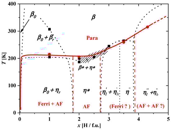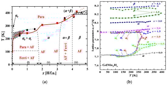 The magnetic (Figure 10a) phase diagram of GdMn2Hx is very similar to that for TbMn2Hx, and one can conventionally identify three x-ranges. In range (i) (x ≲ 1.8 H/f.u.), with decreasing temperature, there is a decay of the high-temperature regular phase into, initially, three phases with different hydrogen contents. The phase with intermediate hydrogen content rapidly disappears with decreasing temperature. The other two clearly segregate into “hydrogen-poor” (x ≲ 0.05 H/f.u.) and “hydrogen-rich” (x ≈ 1.8 H/f.u.) phases. In range (ii), corresponding to 1.8 ≲ x ≲ 3.2, there is only a regular phase throughout the temperature range. In the range (iii) above x ≈ 3.2 H/f.u., the regular phase is transformed to the rhombohedral phase through the area of coexistence of two phases, including the regular phase and the rhombohedral phase [,]. Also, the course of changes in lattice parameters versus temperature (Figure 10b) is very similar to those noted for TbMn2Hx. A clear spinodal decomposition is visible for x ≲ 2 H/f.u.