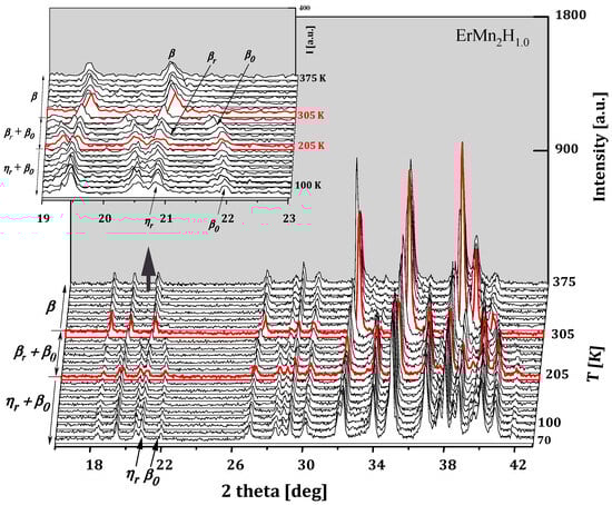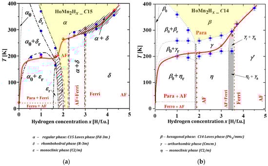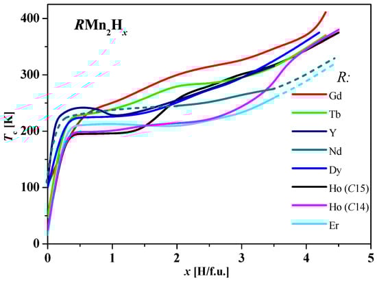 With a temperature change, the RMn2Hx hydrides undergo complex phase transformations in many cases, which, combined with the often occurring multi-phase states, makes the interpretation of their X-ray diffraction magnetic transformation results extremely difficult. Some authors have even argued that it will never be possible []. One of the first hydride families to be studied over a wide range of x and temperature changes was YMn2Hx, showing a very wide range of structural transformations as a function of temperature. In contrast, TbMn2Hx hydride families show a very ‘modest’ spectrum of structural transformations. Very interesting are the structural and magnetic properties of HoMn2Hx hydrides, in which the base compound can crystallize in a C14 or C15 Laves phase structure, depending on the sample preparation [].