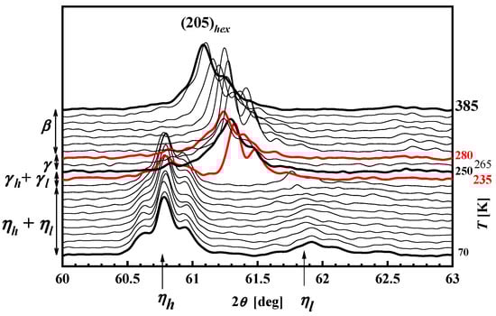 Below the temperature range ~300–400 K and along with the increase in hydrogen content, a structural transformation from the regular phase α′ (from the range 2) to the rhombohedral phase δ through the two-phase area (α′ + δ) occurs. The δ phase is a rhombohedral phase belonging to the spatial group [].