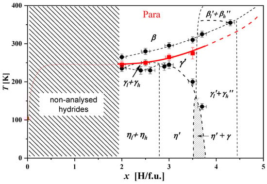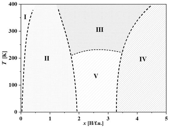 Due to the similarity of its electronic structure to that of lanthanides, yttrium is classified as rare earth element. The host YMn2 compound shows a large increase (about 5%) in elemental cell volume near 100 K in X-ray diffraction measurements. A temperature hysteresis of several degrees is also observed (compare with Figure 1a). Hydrogen in the YMn2Hx induces a number of structural and magnetic transformations that best are represented by the phase diagram (Figure 7). The structural and magnetic phase diagram for YMn2Hx hydrides can be distinguished into three ranges [,,,,,].