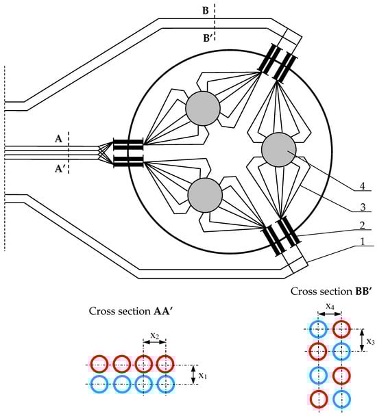 Cross-sections of bifilar high-current busduct (red—pipes with forward currents, blue—pipes with return currents).