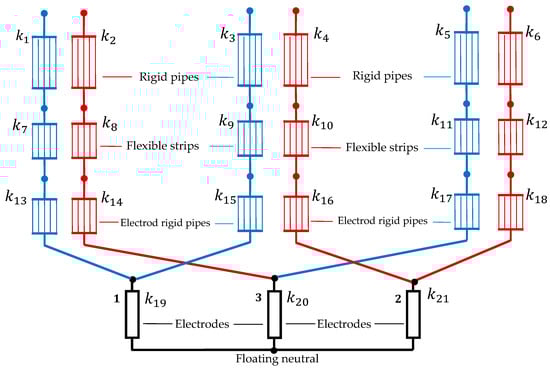 During the system analysis, these elements were numbered sequentially. Numbering in the circuit starts successively from the tubular wires of the high-current busduct, through the flexible part and the connection to the electrodes, ending with the electrodes. In the set of N elements of the furnace power supply system, means the number of the element which is the last one in the l-th bundle of wires connected in parallel, leading the current in the same direction of a given phase. The full set of element numbering made in this way is as follows: