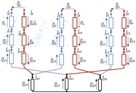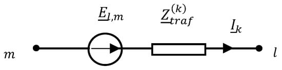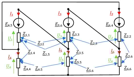 In this way, the impedance matrix is generated, which combines the voltage drops on the high-current circuit elements with the corresponding total currents of these elements. This matrix is the starting point for the analysis of the flow of currents in the elements of the high-current busduct. For this purpose, the voltage excitations realized in the system by transformers are modeled using the ideal electromotive force with internal impedance (Figure 4).