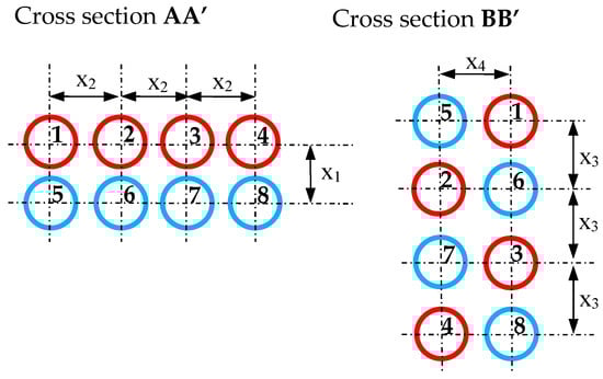 which determine the mutual location of the tube axes for the AA’ and BB’ cross-sections as shown in Figure 6. In this way, a matrix function of an independent vector variable of parameters was obtained. Let us then assume that the furnace supply voltages are symmetrical and that the equivalent resistances of the zones near the electrodes are the same, which can be written in the following form: