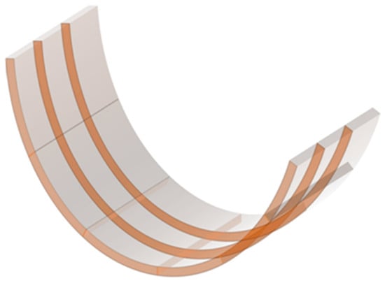 Due to the movement of the electrodes in relation to the fixed part of the track, a solution was introduced to connect these parts with a U-shaped package of sheets (Figure 8). Figure 9 shows a cross-section of the feed to the electrodes from only one phase connected to one side of the electrode. In the computational example, the skin effect and the proximity effect were examined for a parallel section of a given length of copper sheets.