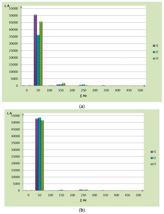 Therefore, the measurements were carried out for two operating states of the furnace, i.e., before modernization and after modernization. During the measurements, time courses of voltages and phase currents of the electrodes were recorded. Figure 10 shows the occurrence of current harmonics in both operating states. Before modernization, a symmetrical state of currents was not possible. A dead phase phenomenon then occurred, which significantly reduced the production efficiency.