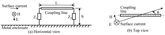 Figure 1 depicts the basic structure of a directional surface current sensor. Coupling lines are installed parallel to the metal enclosure, and both ends are connected to the metal enclosure through specified impedances, Z1 and Z2. When the surface current generated by PD flows into the sensor, the coupling lines are induced and excited by the electromagnetic field of the surface current. An electric field is generated in the normal direction to the enclosure, producing a potential difference between Z1 and Z2 based on the distance between the coupling lines and the enclosure. Additionally, a magnetic field is generated in the direction parallel to the enclosure, producing a potential difference between Z1 and Z2 based on the cross-sectional area of the sensor. If the length, L, of the coupling lines is sufficiently small when compared to the wavelength of the surface current and Z1 = Z2 = W, currents are induced in impedances, Z1 and Z2, according to Equations (1) and (2) as follows [15]:
