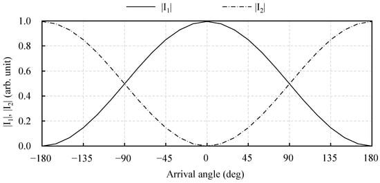 Equations (1) and (2) show that the detected currents, I1 and I2, vary depending on the incident angle, θ, of the surface current, indicating that the sensor has directivity. The relationships between |I1|, |I2| and the incident angle, θ, of the surface current exhibit sine wave curves, as shown in Figure 2. For example, at θ = 0°, I1 ≠ 0 and I2 = 0, whereas at θ = −90° and 90°, I1 = 0 and I2 ≠ 0.