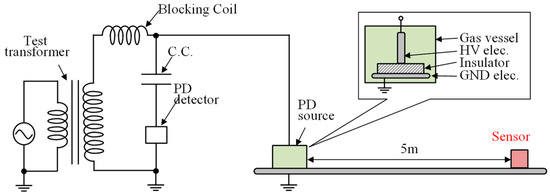 Thus far, we have developed methods for estimating the direction of arrival of sensors and PDs in gas-insulated switchgear with cylindrical and rectangular shapes, and have experimentally verified their effectiveness [13,14]. In these validations, we have used discharge sources with high discharge intensities, making it a challenge to verify the effectiveness of these methods for the small discharges that occur in actual equipment. Furthermore, improving the signal-to-noise (S/N) ratio is necessary for small discharges.