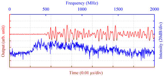 Figure 5 depicts an example of the waveform detected using the sensor for an installation angle of φ = 0° and terminal 1. A signal was generated for a period of approximately a few microseconds from the time of the signal detection near the horizontal axis at 0 μs. It is considered that along with the direct wave from the discharge source, the reflected wave from the surrounding structures also arrived with a time lag, resulting in a continuous signal. Additionally, Figure 5 presents the frequency characteristics obtained via Fourier transform. The frequency components were primarily in the 500–1000 MHz band. The sensor can detect high-frequency components [16] of SF6 discharge.