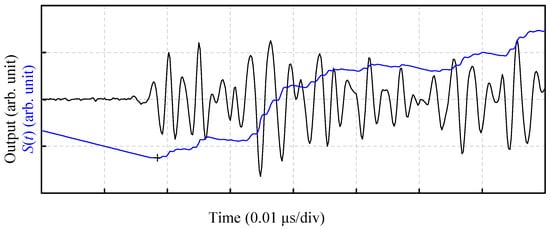 Figure 6 depicts a plot of S(t) calculated from the waveform shown in Figure 5 and the resulting signal detection time. The figure presents an enlarged view of the vicinity of the signal detection on the x-axis from Figure 5. The second term on the right-hand side of Equation (3) was larger until the arrival of the surface current; therefore, S(t) monotonically decreased. However, when the surface current arrived, the first term became larger, and S(t) increased. Consequently, the time at which S(t) changed from a monotonically decreasing to an increasing trend, that is, the time at which S(t) was at its minimum value, can be determined as the arrival time of the surface current. Figure 6 also shows S(t) calculated from the detection waveform in Figure 5, exhibiting the minimum value of S(t). The obtained signal arrival time is observed to be reasonable.