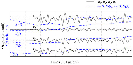 In Equation (4), vi represents the detected voltage, and N represents the number of samples. The first term on the right-hand side of Equation (3) represents the cumulative energy obtained by integrating the squared detected voltage up to time t. The second term represents the summed cumulative energy over the entire region. As shown in Equation (4), it was averaged over the region and denoted as δ. The difference between these terms yields S(t).