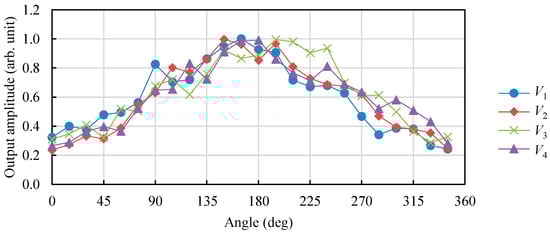Figure 7 presents the detection waveforms, v1–v4, of terminals 1–4 and the corresponding S1(t)–S4(t) values. While each terminal detects the signal at approximately the same time, the signal strength differs, with v1 > v3 ≒ v4 > v2. Because the output of each terminal can be zero when the signal arrives from a certain direction, the arrival time of the signal is determined to be the earliest point at which S(t) is at the minimum value among the minimum points obtained from each terminal. The waveform amplitude at that time was recorded for each terminal. Figure 8 depicts the signal strengths, V1–V4, for each terminal when the sensor orientation was changed. The signal strength at each terminal varied with the sensor orientation, demonstrating the directional sensitivity of the sensor. In the following sections, the arrival direction of the surface current is estimated using the sensor. The theoretical waveform, represented by the sine curve in Figure 2, generally matches the experimental data. The deviation from the theoretical curve is attributed to the variation in the discharge amount at each orientation and the increasing influence of noise in the direction where the signal strength was small.