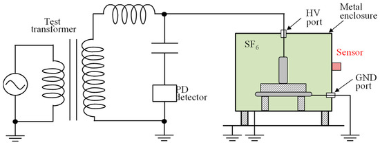 The PD source was modeled as a creepage discharge model, consisting of a high-voltage electrode with a diameter of 10 mm, an insulating resin board with a diameter of 50 mm and a thickness of 1 mm, and a grounding electrode with a diameter of 80 mm. This setup simulates surface PDs occurring on the insulating material’s surface in actual equipment. The PD source was placed under a SF6 atmosphere. A high alternating current (AC) voltage (approximately 10 kVrms), generated by a test transformer, was applied to induce the PD and surface current. The discharge was measured using a PD measurement instrument, and the value ranged from 10 pC to 1000 pC. Certain variations existed in the discharge charge, which could be a source of error in the direction estimation of the discharge generation. The methods used to rectify the effects of these variations are discussed in the later sections of the paper.